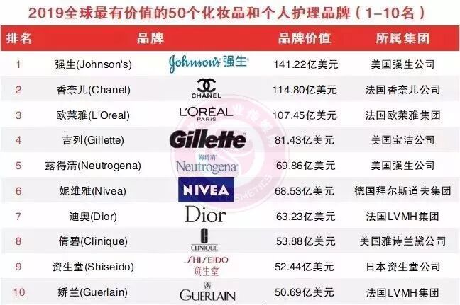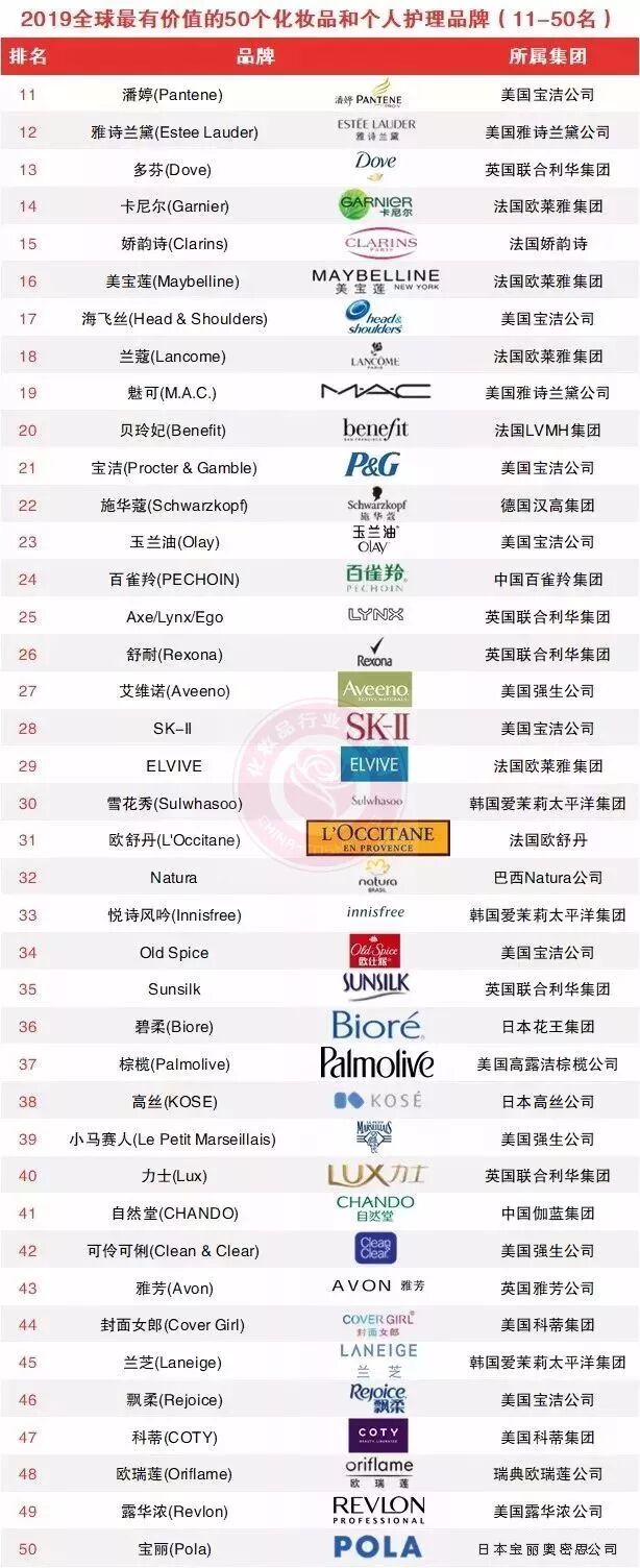 50个品牌仍然更多的集中在全球几大消费品集团手中。其中,美国宝洁公司最多共有7个品牌,美国强生公司、法国欧莱雅集团、英荷联合利华集团各有5个品牌,法国LVMH集团、韩国爱茉莉太平洋集团各有3个品牌。