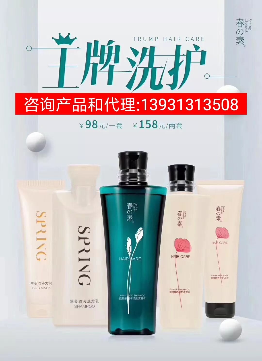 售价:98元一套,158元两套(单瓶洗发水或发膜68元一瓶)