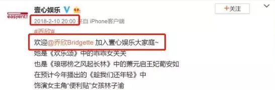 2018年2月份,谋求个人发展的乔欣选额离开正午阳光,加盟壹心娱乐。当时热度正高的乔欣,或许是看上了壹心娱乐的宣传能力,增加自己知名度,当时的正午阳光也在转型,重心更多放在制作影视作品上,对于艺人的宣传可能会降低。