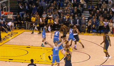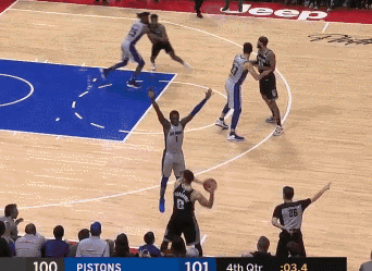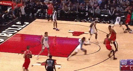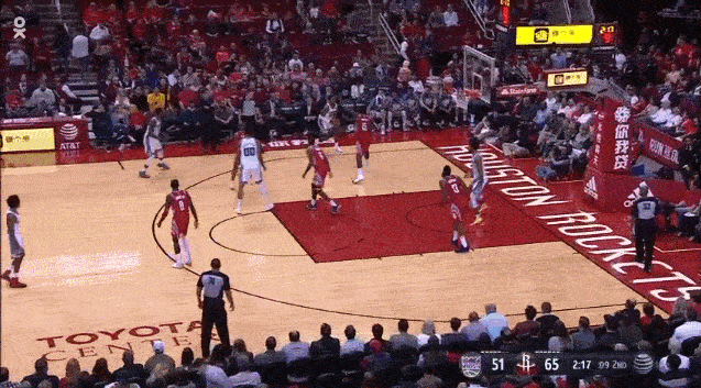 下面这个gif是希尔德对汤普森的防守,可以看到,面对掩护,希尔德努力地挤过,没有让汤普森在绕掩护兜出来后第一时间有出手的机会,随后在汤普森突破时,希尔德的步子咬得非常紧,并最大程度地干扰了汤普森的投篮,最终汤普森以一个三不沾完成了本次进攻。可以说,本次防守从挤过掩护开始到最后干扰出手,希尔德的每一个防守细节都非常到位