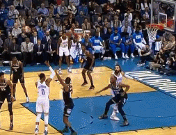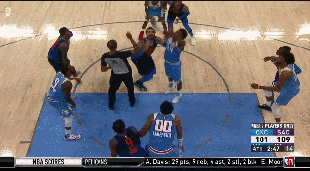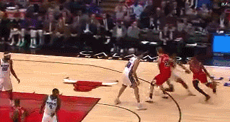 在自己打出去一个进攻篮板,让香波特命中3分后,他又招呼队友们上来做全场紧逼防守,小狐狸很配合地上来了,并造成康利的进攻犯规。还是不以结果论英雄,截这个gif,不是因为小狐狸造成了康利的进攻犯规,而是因为希尔德在大比分落后时招呼队友上来加强防守的压迫性。