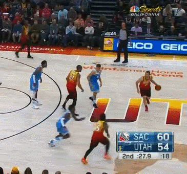 希尔德本来是个纯射手,这让他对自己的投篮充满自信,但是与此同时,他也会因此忽略处在更好位置的队友,像下面这种球,原生态的希尔德是很难想到“多一次传球”分给底角被放空的贾斯丁-杰克逊的