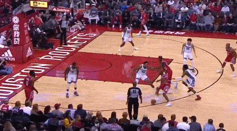 在对方打挡拆时积极的轮转过来防守内线,又在火箭转移球到外线后努力地扑到外线去防3分