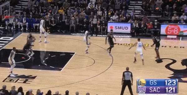 下面这个球的背景是国王客场挑战勇士,最后时刻国王落后勇士两分,国王的边线球已经形成了有效的战术,兜出来无人防守的希尔德此时却犹豫了,刚刚命中两记三分,将比赛悬念重新带回来的希尔德此时拥有一个空位3分绝杀的机会(虽然稍微有点儿远吧,但他有这个射程),但他却没有选择果断出手,而是令人匪夷所思地选择了突破,最终以一记后仰三不沾输掉了比赛