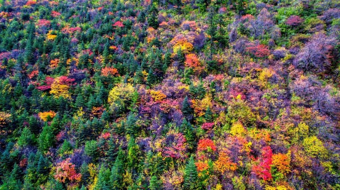 每年9月至11月,毕棚沟漫山遍野的赤橙红绿青蓝紫如泼墨一般洒满整个山林,其中以红枫、鹅掌为代表的红叶彩林装扮出了一个七彩的童话世界。