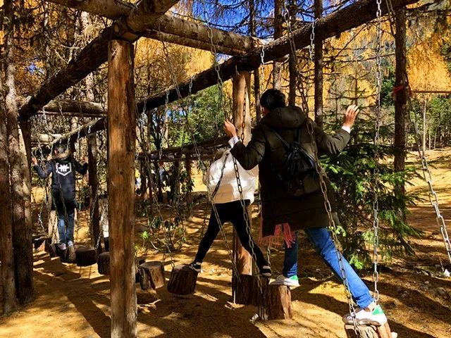 彩林层层叠叠,颜值爆表。加上活泼机灵的动物在期间穿梭,更具生机。此时,可爱的人们荡着秋千、坐着跷跷板、走着圆木吊桥......在彩林间,欢声笑语,不亦乐乎。
