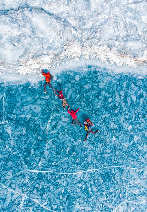 在冬天,整个湖面完全结冰,走在湖面,四周不断有冰裂的声音,混着声响,在空无一人的湖面上有些震撼。