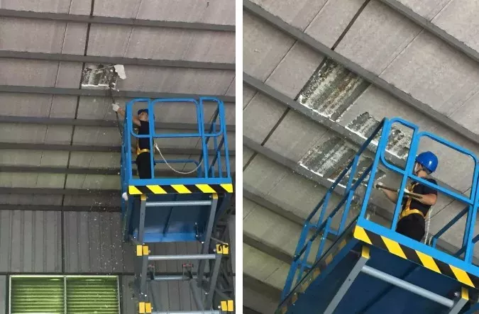 近期,深圳两名工人给某店安装招牌,在给招牌安装铁皮雨棚时,由于雨棚有些长,两人安装有些困难。于是,其中一人爬上了店铺门口的一堵高约1.37米的矮墙。由于高度还是不够,便又拿来一个胶水桶(高约0.4米),放在矮墙上垫在脚下。