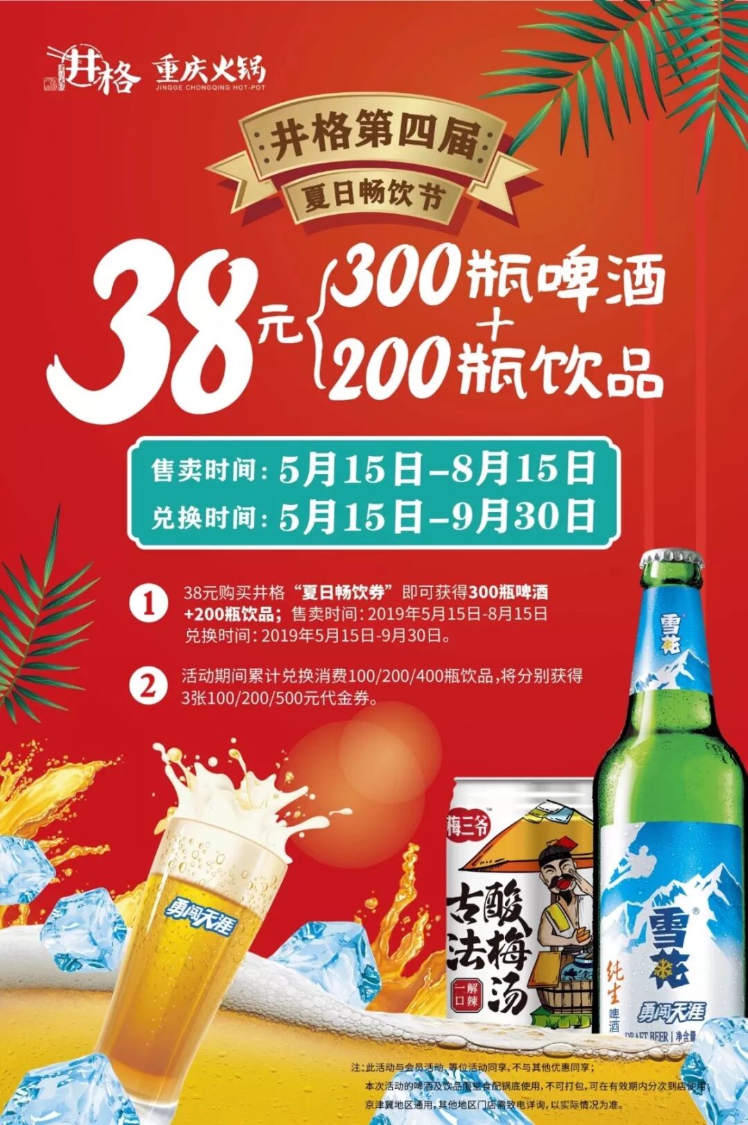 夏季一般都是火锅的淡季,井格火锅为了提升夏季的销量,发起了一个“38元畅饮节”的campaign。用户只需要花38元就可以获得500 瓶饮品(300 瓶啤酒 + 200 瓶酸梅汁),算下来每瓶饮料其实才几分钱,用户贪便宜的心理很容易被触发而产生购买行为。