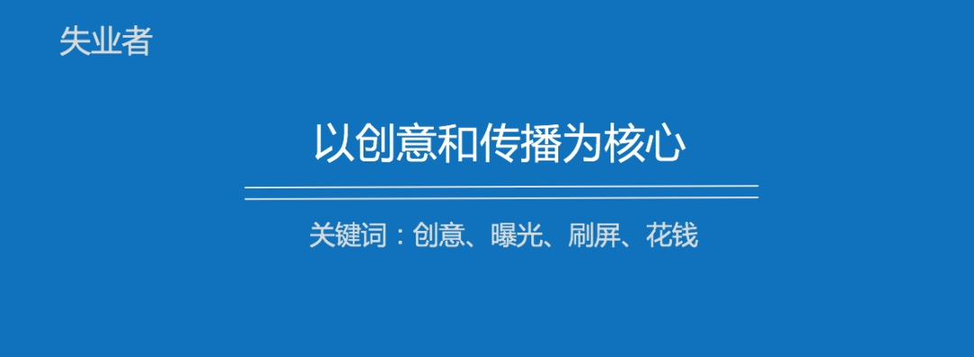 失业者和进化者失业者和进化者作为互联网的市场人,谁将成为失业者,谁又将是进化者?我们先做一个简单的测试,看看你是哪类市场人?你是否存在以下描述的情况:? 没有市场预算就不知道怎么工作因为H5要钱,拍摄视频要钱,找KOL要钱……;? 更注重“创意本身的创意”比如H5的交互玩法、视觉呈现,视频拍摄手法,海报的设计,怎么做事件营销等等。? 不管什么热点,逢热点必蹭蹭热点的方式就是做一张海报发朋友圈,写一篇文章发官方公众号。? 追求强曝光和刷屏效果整天就是想如何能做出刷屏的案例。? 以传播数据指标为KPI将每次传播的阅读、评论、转发、播放量、曝光量的作为考核指标。这类市场人是公司的“首席花钱官”,线下广告投放1000万起,拍个视频100万起,做个H5不能少于20万,一旦钱少了就没办法开展工作。他们非常重视创意本身,比如视频怎么拍,H5怎么做、动态海报要怎么设计才好等。考核指标一般是传播数据,阅读、点赞、评论、播放量等。他们喜欢蹭热点,能做出刷屏的创意往往是这类市场人的最高指标。我们常常听到这类市场人说的话是这样的:? 哇,那个H5又刷屏了;? 这个视频太走心了,播放量超过1000万了;? 那个创意真沙雕,太有意思了;? 这个文案写得真好;最近流行国潮的玩法;……。我们把这类市场人叫做“以创意和传播为核心”的市场人,这类市场人是未来最有可能成为“失业者”的市场人。