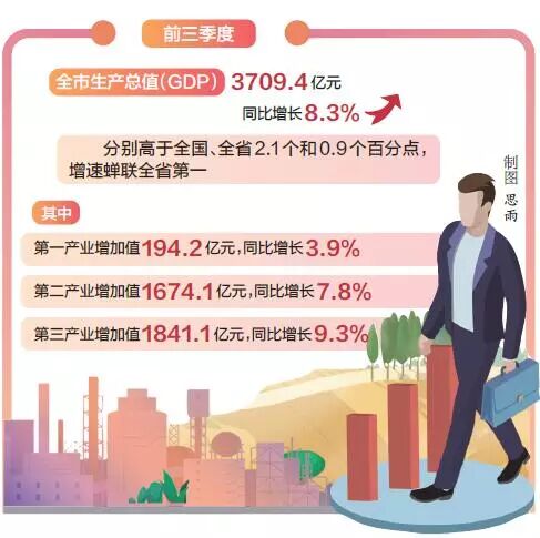 前三季度,全市规模以上工业增加值同比增长8.4%,增速比上半年回升0.3个百分点,高于全省0.5个百分点。高新技术产业持续快速增长,前三季度高新技术产业增加值同比增长18.2%,快于规模以上工业9.8个百分点,占规模以上工业的比重达到41.8%,同比提高6.1个百分点。