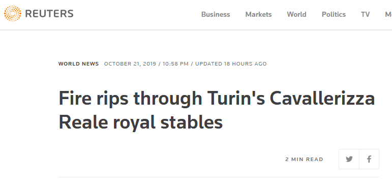 据路透社21日报道,位于意大利都灵的皇家马厩与马术学院(The Cavallerizza Reale)当天遭遇大火,火势蔓延了约2小时,所幸没有人员伤亡。