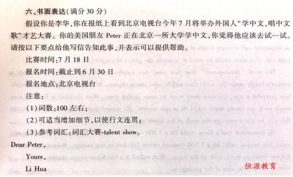 I read in a newspaper today that a“Learn Chinese,Sing Chinese Songs”Foreigners' Talent Show will be held in Beijing Television Station on July 18. I know you like singing,and you are in Beijing during that period. I think this is a good chance for you to show your singing talent ,and how well you've learned Chinese. If you would like to try,you'll have to go to the TV station to sign up before the end of June. If there is anything I can do for you, I would be glad to help.