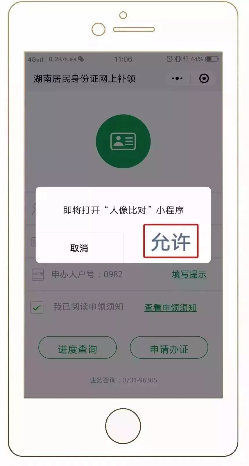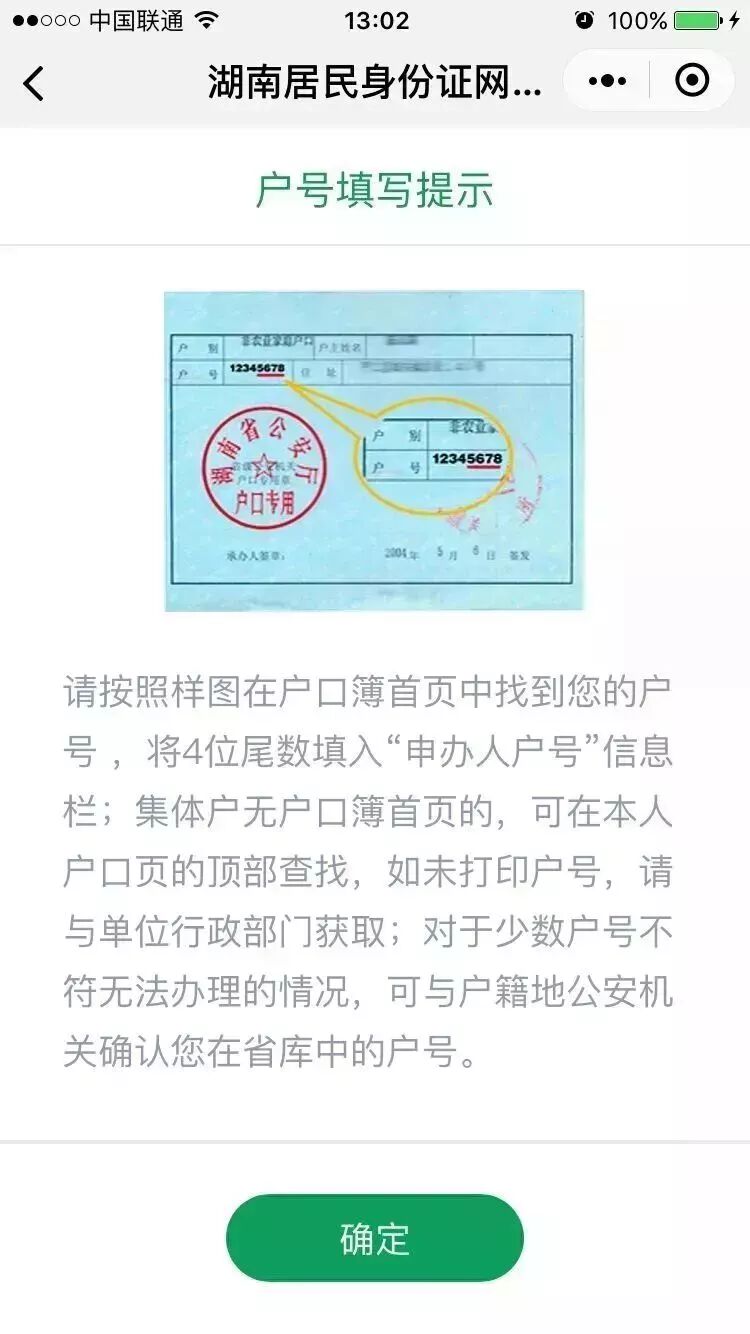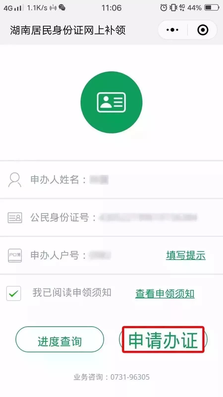 进入“湖南居民身份证网上补领”页面,输入申办人姓名、公民身份号码、申办人户口簿户号的4位尾数,查看“申领须知”后勾选【我已阅读申领须知】,然后点击【申请办证】
