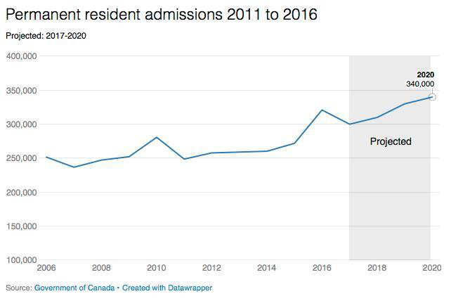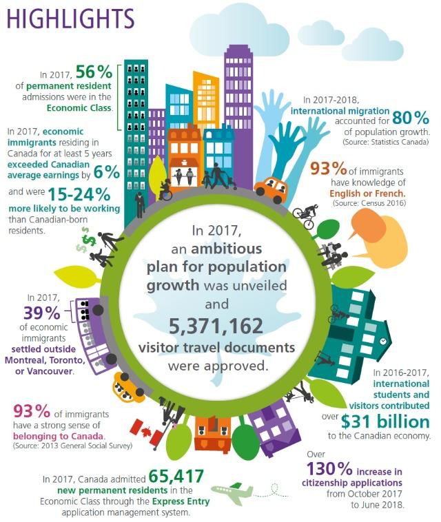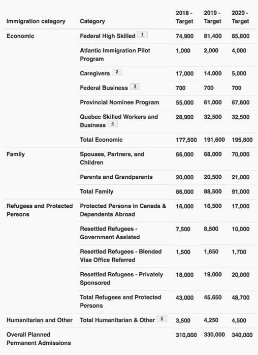 在未来2018-2020接下来3年将接受100万新移民,分别在2018年接受31万新永住居民,2019年为33万,2020年为34万。移民主要分三大类别,经济类、家庭团聚类以及难民类,其中一半以上为经济类(非投资类)移民身份!