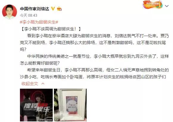 不过李小璐给甜馨举办生日派对令作家刘信达很不满,他今日一早发了微博点名批评了此事。但人家家长想怎么给孩子过生日是别人的家事,倒也无需多言。这人怼天怼地什么热度都要蹭一下也是挺无语的。