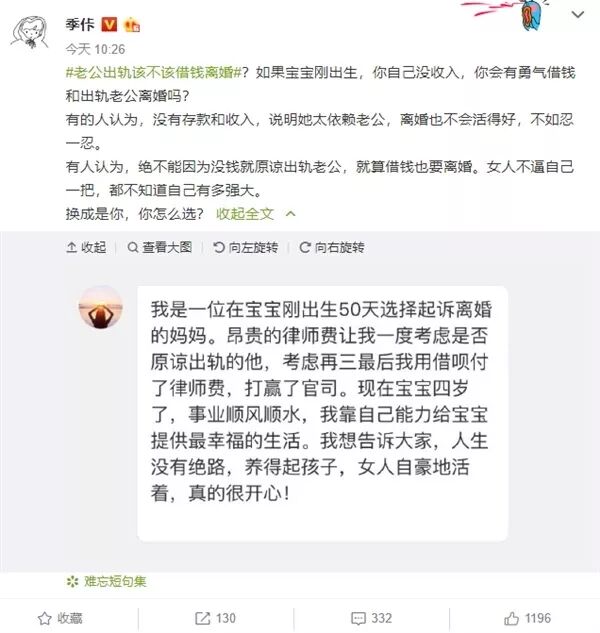 今日,知名情感博主@季佧 分享了一位女网友投稿:“我是一位在宝宝刚出生50天选择起诉离婚的妈妈。昂贵的律师费让我一度考虑是否原谅出轨的他,考虑再三最后我用借呗付了律师费,打赢了官司。现在宝宝四岁了,事业顺风顺水,我靠自己能力给宝宝提供最幸福的生活。我想告诉大家,人生没有绝路,养得起孩子,女人自豪地活着,真的很开心!”