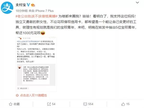 对此,支付宝官微表示:“为啥都来圈我?哈哈!看明白了,我支持这位妈妈!独立又勇敢的新女性,不论花呗借呗信用卡,都希望是一个能让自己变更好的工具,做理性有规划就是我们的宝呗青年,来吧,明晚在转发中抽出5位宝呗青年,帮还1000元花呗。”