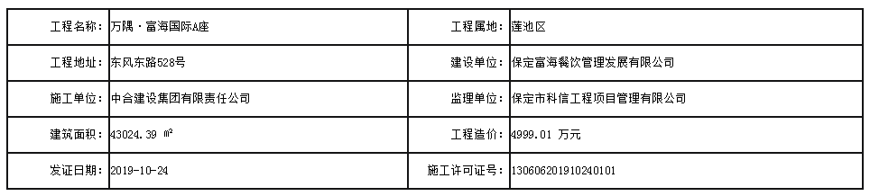 保定市住房和城乡建设局发布一则施工许可信息,涉及莲池区万隅·富海国际A座 ,详情如下——