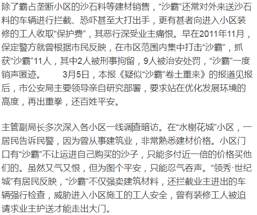 3月5日,涉嫌“萨巴”的举报回来后,市公安局高度重视,在市区范围内开展了打击和惩治“萨巴”的综合行动。在3月16日的统一行动中,抓获了15名“沙巴”。萨巴“扰乱居民,威胁业主安全”。“沙巴”是指居住在一些新社区,以暴力、威胁等手段向居民高价出售沙石材料等装饰材料的人群。