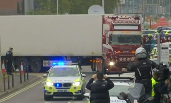 10月22日周二晚上11点半,一个白色的集装箱在伦敦东面33公里外的渡轮码头登岸。凌晨1点刚过,一辆来自北爱尔兰的拖车提走了这个集装箱,继而开到码头东侧的一处工业园区内。凌晨1:40,救护人员接到报警奉召到场,看到令人震惊的一幕:集装箱内横着39具尸体,其中包括1名十来岁的少年。英国警方随后证实,这39名死者均为中国人,其中8女31男。货车司机是一名25岁的北爱尔兰人,他因涉嫌谋杀被立即逮捕。