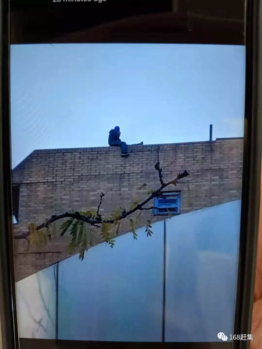 跳楼男子双脚站在楼顶屋檐边,疑与人对话,从肢体动作来看,情绪有些激动,时不时将一只腿伸出屋檐外晃悠。