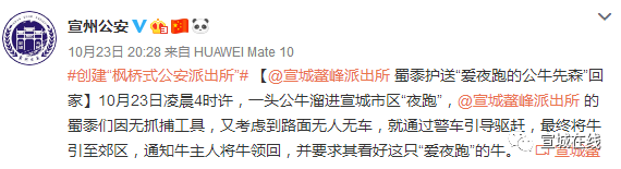 10月23日凌晨4时许,一头公牛溜进宣城市区"夜跑",宣城鳌峰派出所的蜀黍们因无抓捕工具,又考虑到路面无人无车,就通过警车引导驱赶,最终将牛引至郊区,通知牛主人将牛领回,并要求其看好这只"爱夜跑"的牛。