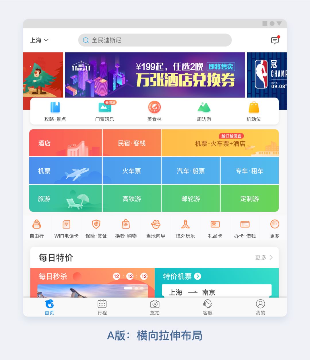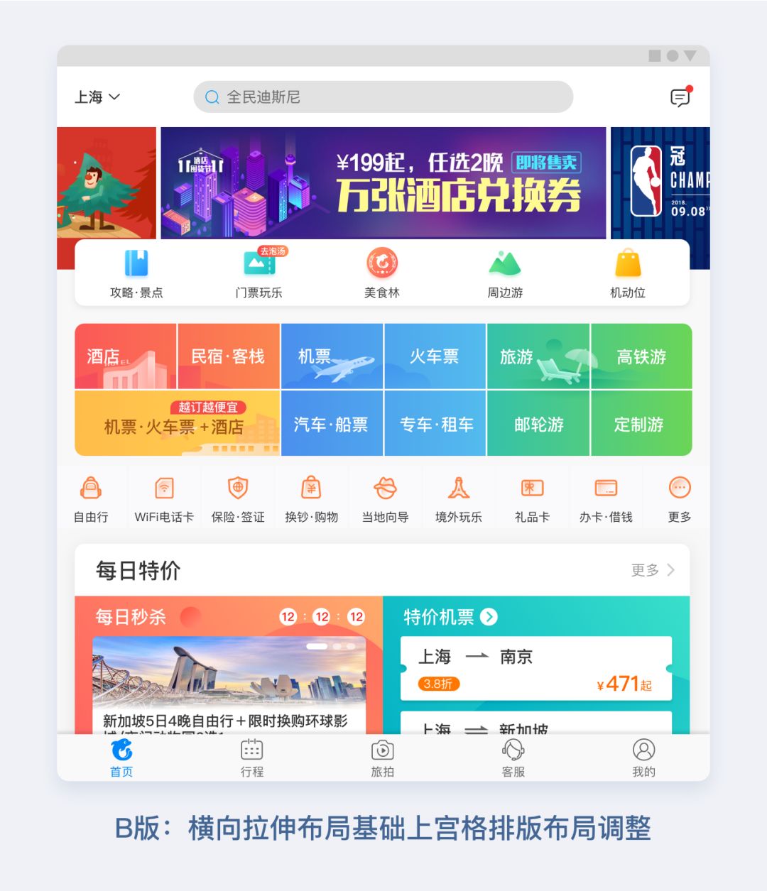 为了验证首页采用挪移布局是否符合用户的心理预期,携程用研团队对于首页方案进行了用户测试。测试中共提供了三个不同的适配方案,A方案在常规首页上做横向拉伸;B方案在横向拉伸的基础上把三行宫格改为两行宫格;C方案采用挪移布局。研究员将三个不同的方案随机拿给用户测试。然后研究员让用户无目地的浏览首页,并询问用户对三种方案的感受,在不引导的情况下,请用户选择更偏好的方案以及描述每个方案的使用感受。