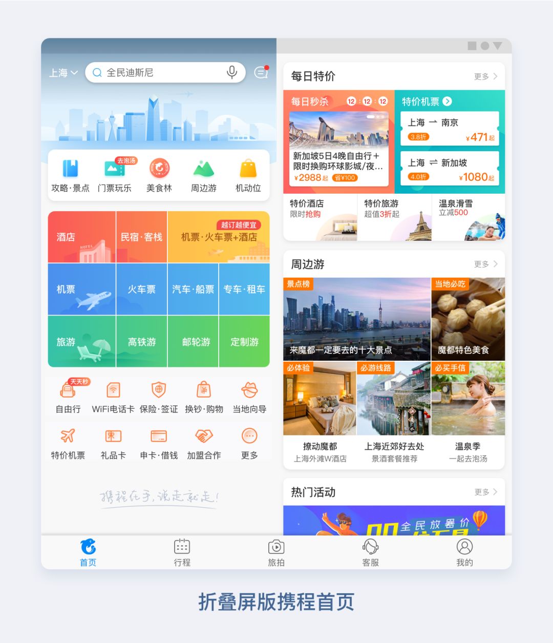 折叠屏为原来需要上滑才能曝光的信息提供了首屏展示空间。携程首页的折叠屏设计采用挪移布局:左侧提供业务入口,右侧提供个性化推荐,同时兼顾主业务分流和信息浏览,在一屏内同时满足用户的不同需求,增强用户粘性,实现内容营销。在设计时,屏幕左侧做固定处理,底部设计“到底了”提示、不可上滑,因为首页属于内容展示型页面,两侧都可滑动不利于内容聚焦。