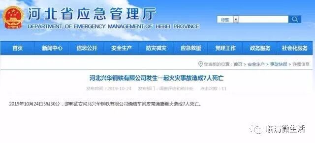 据河北省应急管理厅通报,2019年10月24日3时30分,邯郸武安河北兴华钢铁有限公司烧结车间皮带通廊着火造成7人死亡。