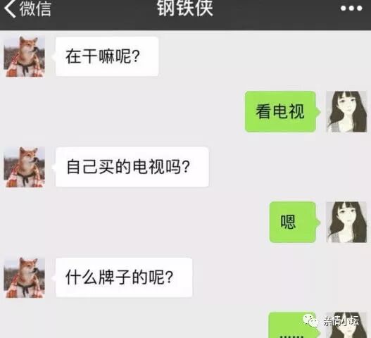 第二个男生为了和心仪的女生聊天,就开启了找话题聊天,但是看完这聊天记录,小编只能说要不要这么尴尬啊,男生问女生“在干嘛呢”,女生说在看电视,而男生还问是自己买的电视吗?还问是什么牌子的,看到女生回复的省略号小编都懂了,女生此刻应该是一脸生无可恋的样子。