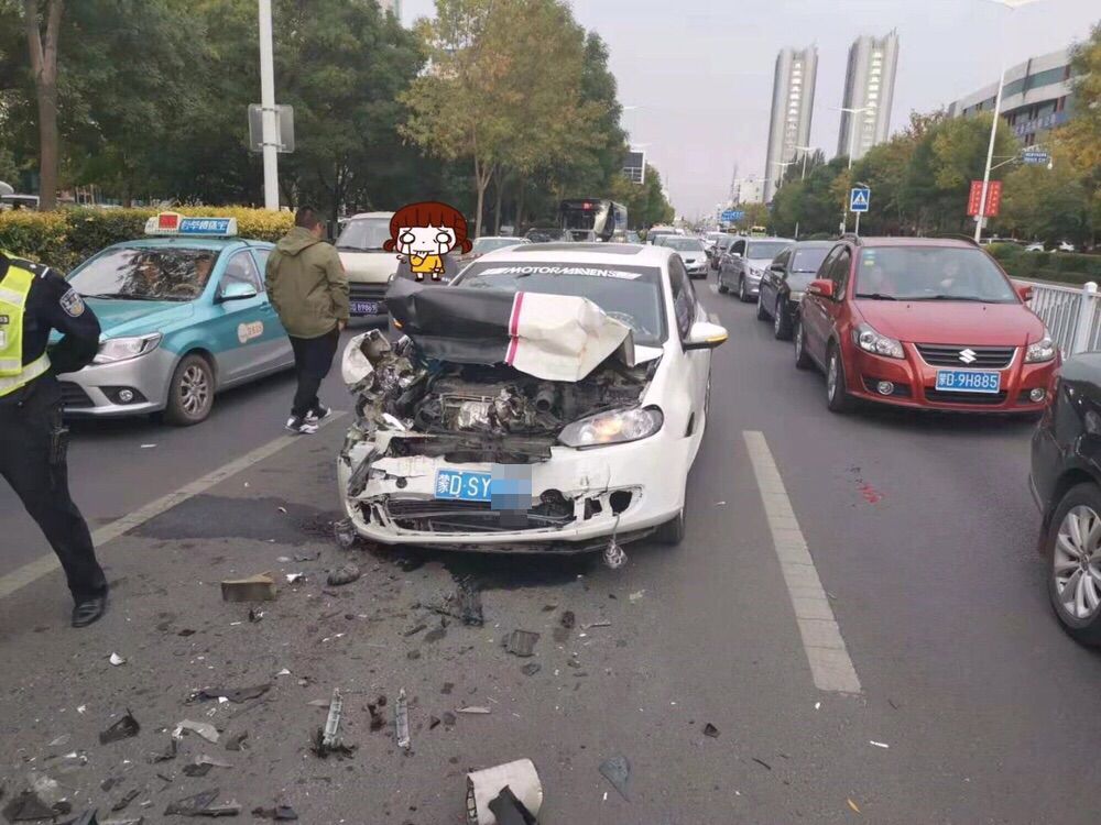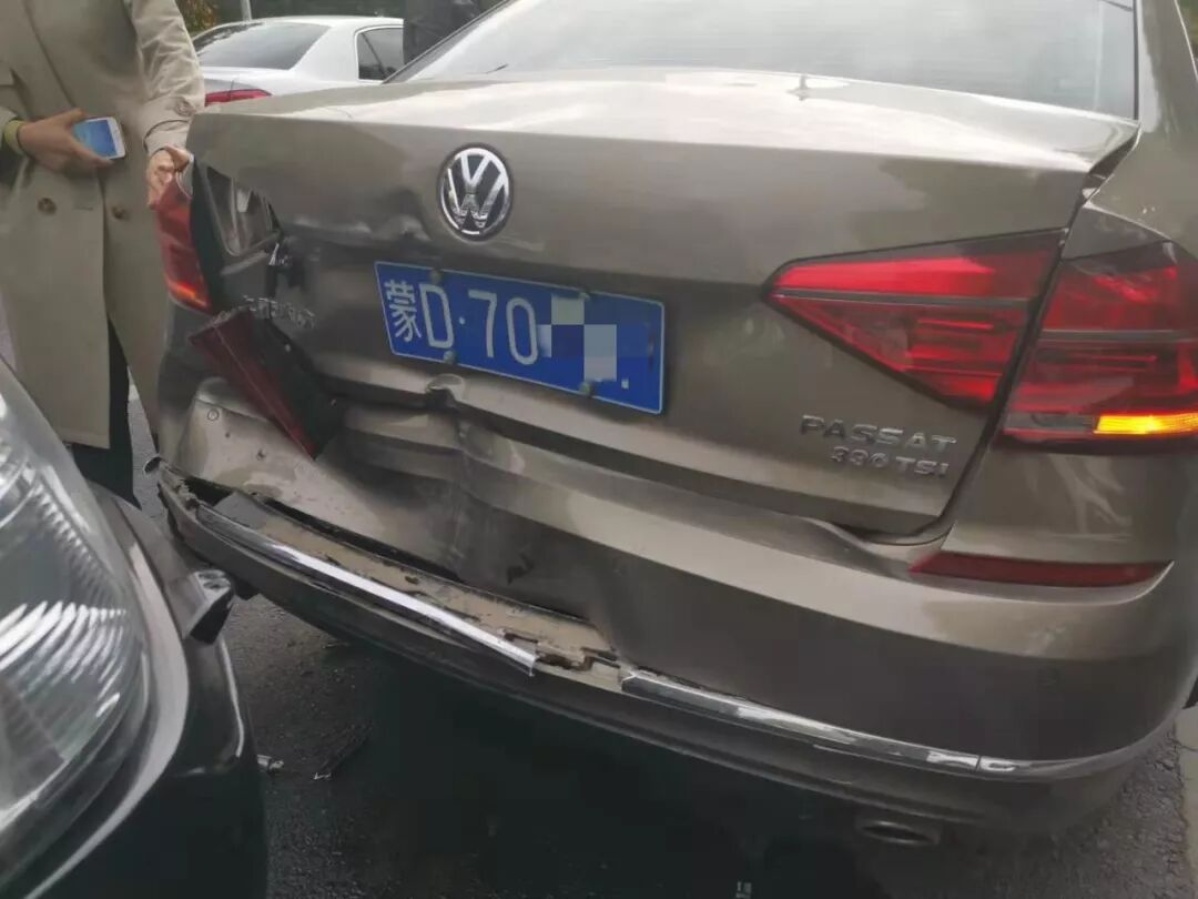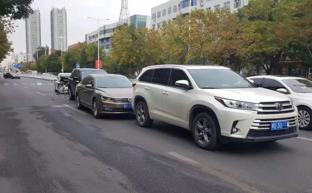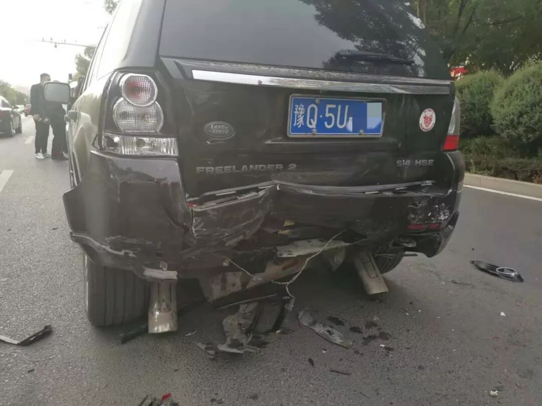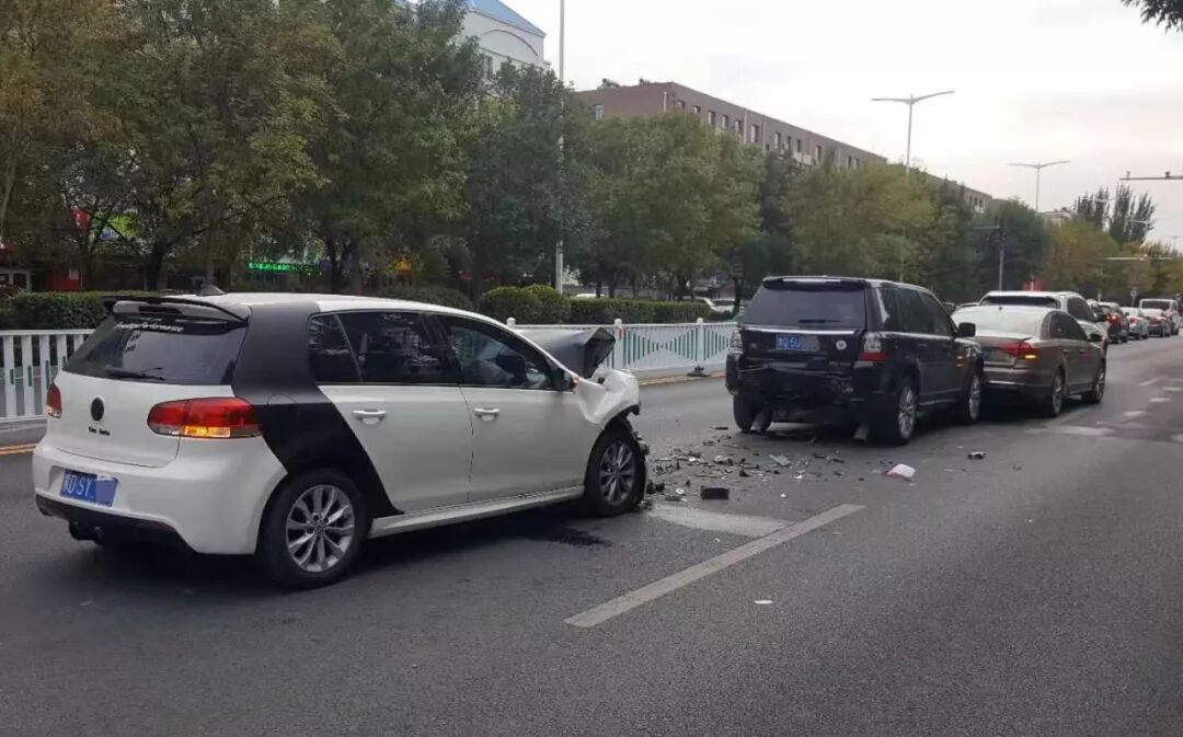 赤峰钢铁街四车追尾连环相撞,路虎和白色轿车受损较重!