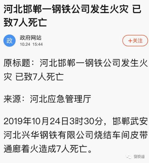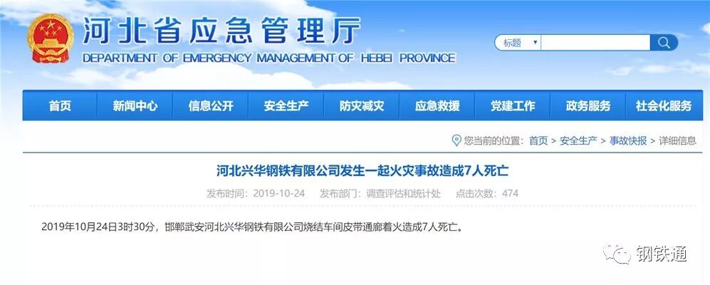 2019年10月24日3时30分,邯郸武安河北兴华钢铁有限公司烧结车间皮带通廊着火造成7人死亡。