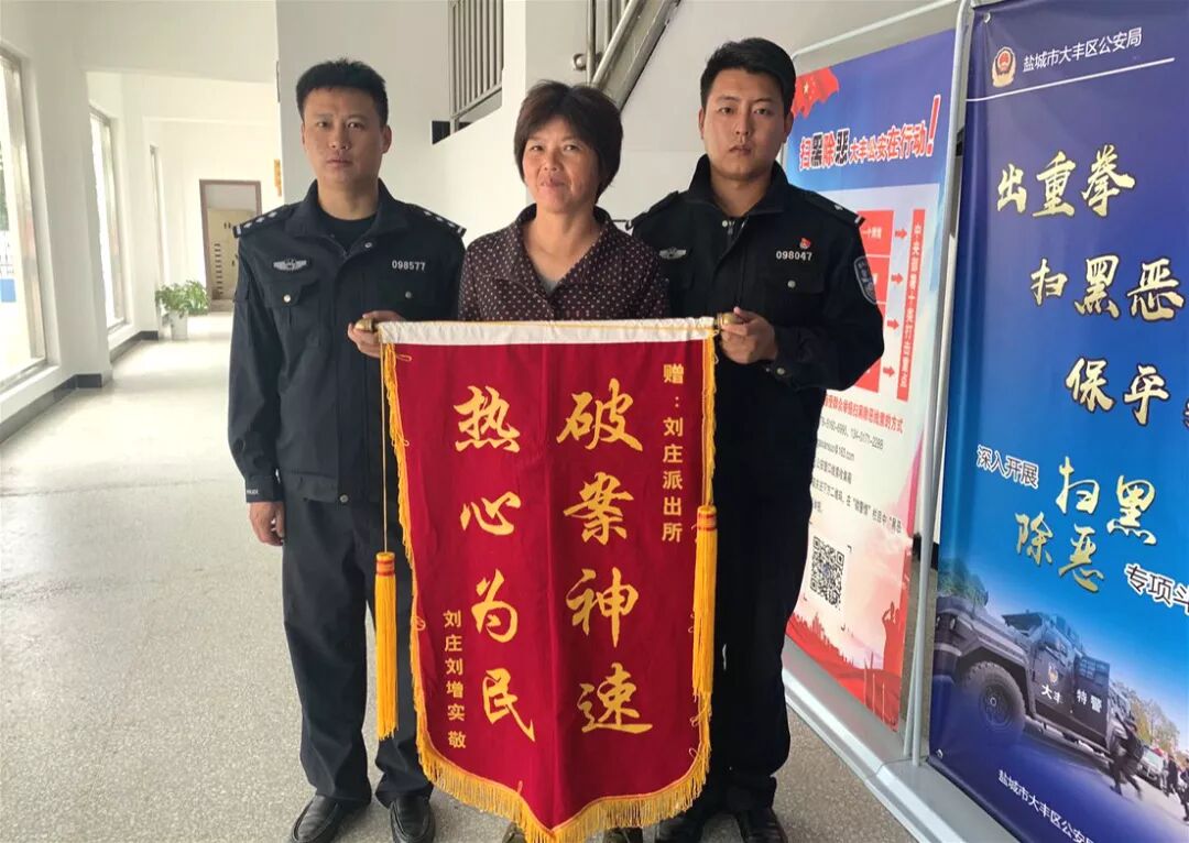为感谢刘庄派出所民警及时挽损单某的家属给办案民警送来一面锦旗写着“热心为民,破案神速”
