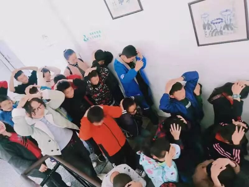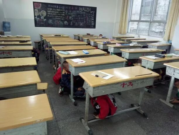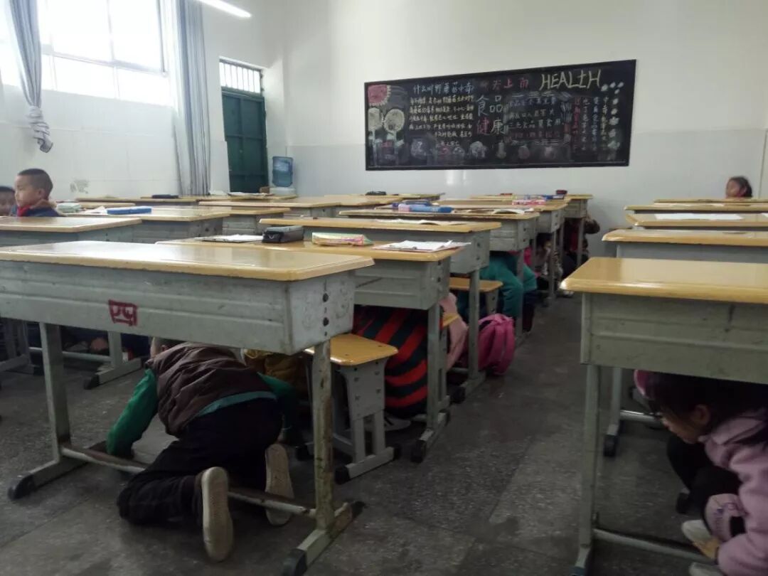 为了搞好这次防震减灾疏散演练,学校召开了安全工作会议,专题部署本次应急疏散演练活动有关事项,制定了工作预案。第三节上课后,由本次演练总指挥刘朝勇老师宣布疏散规则和注意事项。约1分钟后,伴随着“地震”口令响起,学生们便迅速蹲到课桌下或以书本、书包等物品护住头部蹲在课桌旁边。