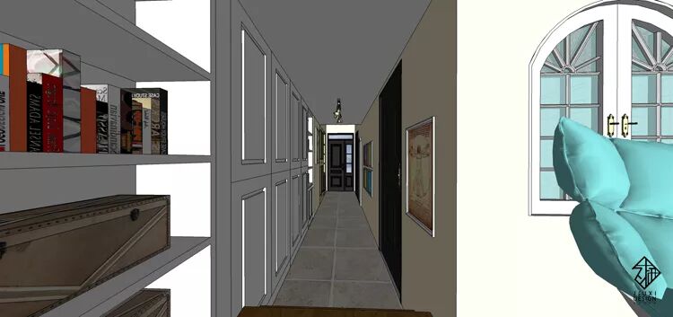 因为降层楼板结构的原因,运用合理尺寸再50公分的台高处,设计了超级储物功能的地台,均分八步台阶缓冲二楼的过渡。