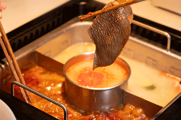难得一见的脱骨鸡爪!白鸡爪进,红鸡爪出,涮几分钟就可以吃啦。口感要比鸭掌软糯的多。