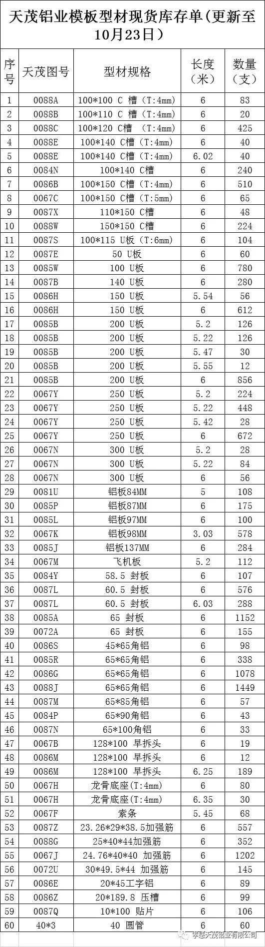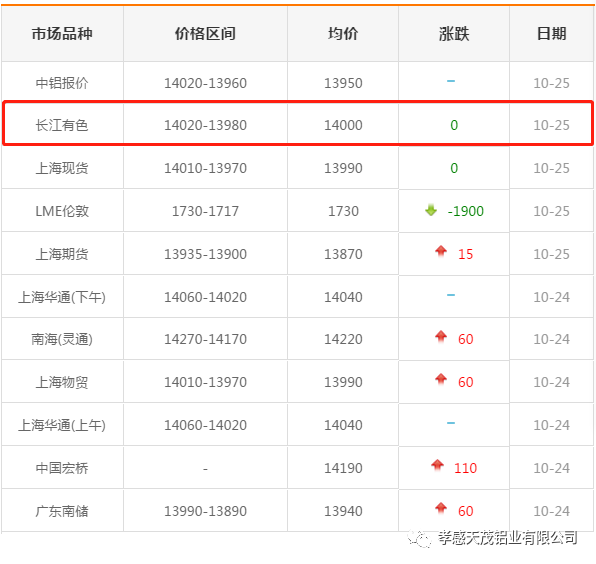 10月25日各大市场铝锭价格表(长江铝价14000 ) 及天茂现有库存表