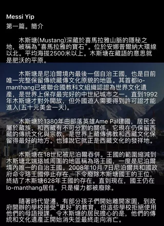 尼泊尔北部与中国西藏接壤地区,有一片深藏于喜马拉雅山脉的藏族聚居区,即被外界称为“静寂之地”的木斯塘县。而今,这个曾经的自治王国已经开始踏入现代社会,咖啡店、商铺、旅店在城镇街头随处可见,各种肤色的外国人在崎岖的山路上穿梭而过。
