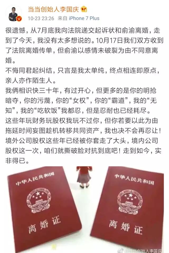此前,当当网联合创始人李国庆发朋友圈表示自己净身出户,李国庆妻子俞渝长文回复李国庆。