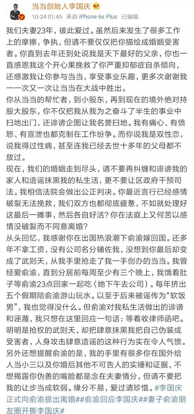 此前,当当网联合创始人李国庆发朋友圈表示自己净身出户,李国庆妻子俞渝长文回复李国庆。