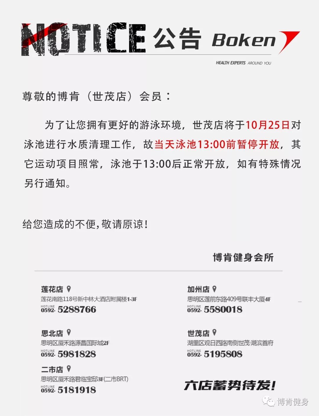 为了大家可以更好的游泳体验,世茂店的泳池将于25号临时进行水质清理工作,各大家带来的不便敬请谅解,各位爱好游泳的朋友注意看好泳池开放时间噢~