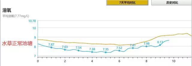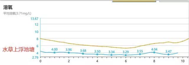 他家的池塘就是上图水草正常的池塘,我们能看到他们家的池塘水体中的溶氧一直都保持在正常水平,所以池塘中的水草才长得很好。螃蟹产量也很高!