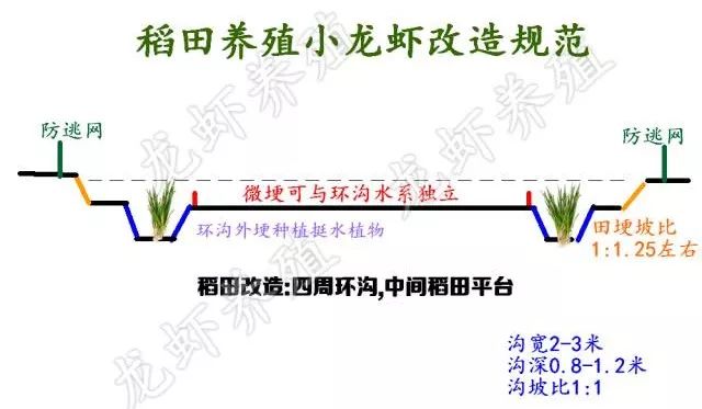 沟深、台浅、坡缓、稻田池塘结构养殖小龙虾优势明显 小龙虾养殖在湖北、安徽、江苏逐渐形成规模,通过扶持渔业科技入户,“以点带面”逐步大面积推广小龙虾稻田养殖。小龙虾养殖对虾池有一定的要求,要想养好小龙虾,稻田、池塘改造很重要,近些年逐步摸索出固定的稻田、池塘开挖方法。掌握了开挖的方法,一次性改造好了,有利于节约工程费用,后期也有利于小龙虾的养殖管理,而且可以连续多年发挥良好作用,对提高小龙虾养殖产量有很大帮助。什么样的稻田、池塘结构最适合小龙虾生长呢?“沟深、台浅、坡缓”最适合小龙虾生长。对于这样的标准,利用池塘养殖小龙虾的养殖户执行起来比较容易,利用稻田套养小龙虾的养殖户会担心沟挖的太宽太深,占面积影响稻谷产量,将来复垦也是一笔不小的费用。所以养殖户应根据地势开挖标准虾池,,开挖池塘时要考虑好进排水的地方,对进出的道路要留有余地,不要过分节约土地,而没有留足进出道路的距离,造成工程结束后返工,或者开沟不标准一二年后环沟淤塞再返工,破坏进洞虾损失就大了!
