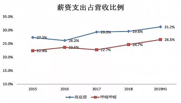 以极致服务为特色的海底捞,人工成本远高于行业平均水平。截至2018年末,海底捞共拥有员工6.9万人,员工平均薪资约为7.3万元,较2017年有所提升,高于业内平均水平。海底捞薪资支出所占营收的比例也是逐年升高,从2015年的27.3%上升到如今的31.2%。并且比同行呷哺呷哺高5个百分点左右。这对于原本就薄利的餐饮行业影响很大。
