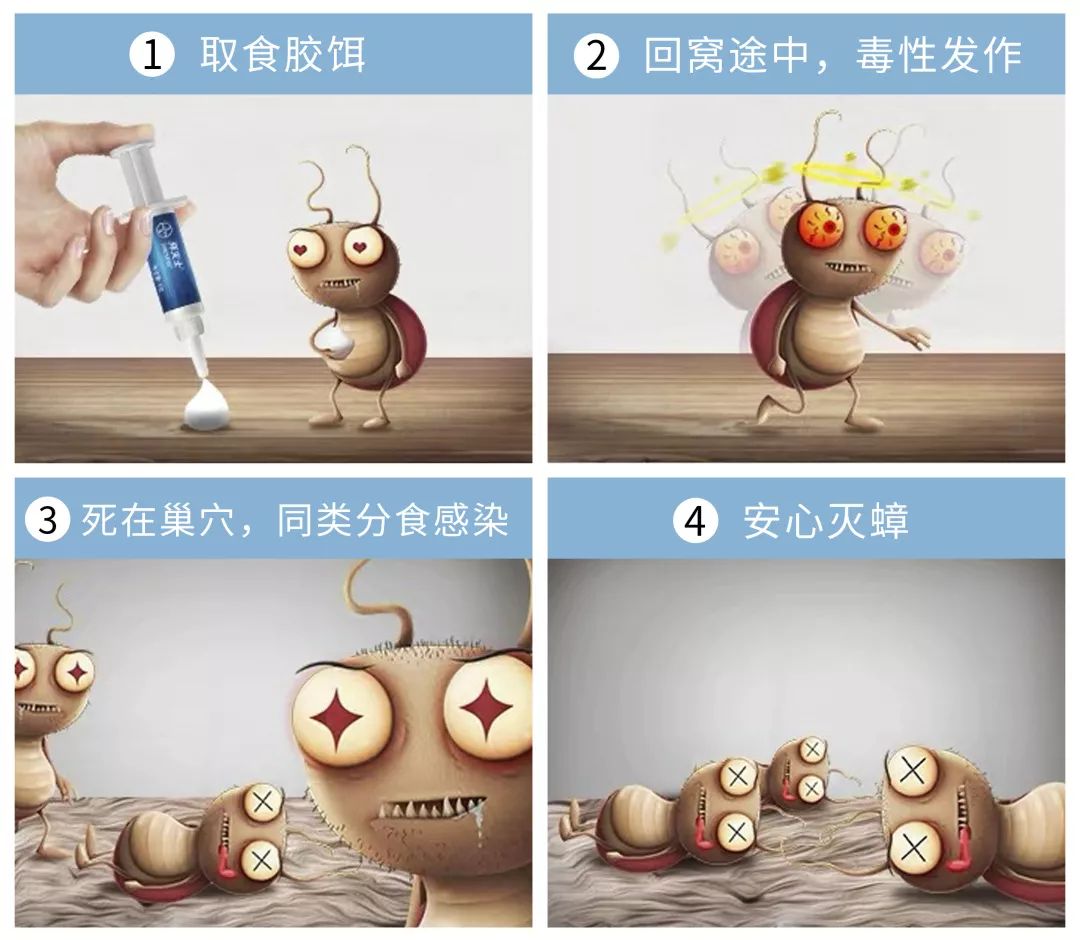 他的原理也很简单,就是把毒死蟑螂的药剂伪装成它爱吃的零食,骗着蟑螂吃下去,让它爬回窝之后,再毒发死亡,利用了蟑螂会互相啃食同伴尸体的习惯,充满毒性的尸体又被同窝的兄弟姐妹吃掉。