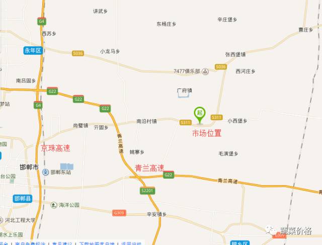 河北省邯郸市永年县311省道23公里处,河北永年农产品批发市场!(地位位置优越,交通方便,市场位置距青兰高速10公里,距京珠高速15公里)