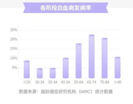 图上显示了不同年龄阶段白血病的发病率,可以看到,20岁以前的发病率较高,后面会有一个回落,到了45岁及以上,白血病的发病率又会逐步上升,所以如果想要选择一款白血病保障,肯定要选保障期限长一点的。