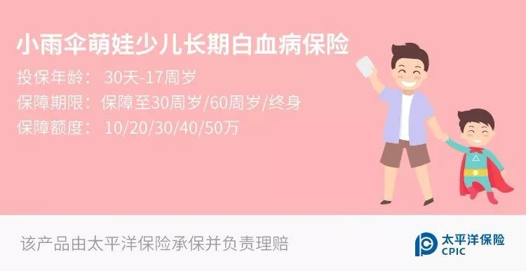 身为家长要做好最坏的打算,万一面临上百万的治疗费怎么办?除了用医保报销一部分,最好再用重疾险搭配白血病重疾险的组合来覆盖这样的大病风险!小雨伞萌娃少儿长期白血病保险作为重疾险的补充就是一个不错的选择。
