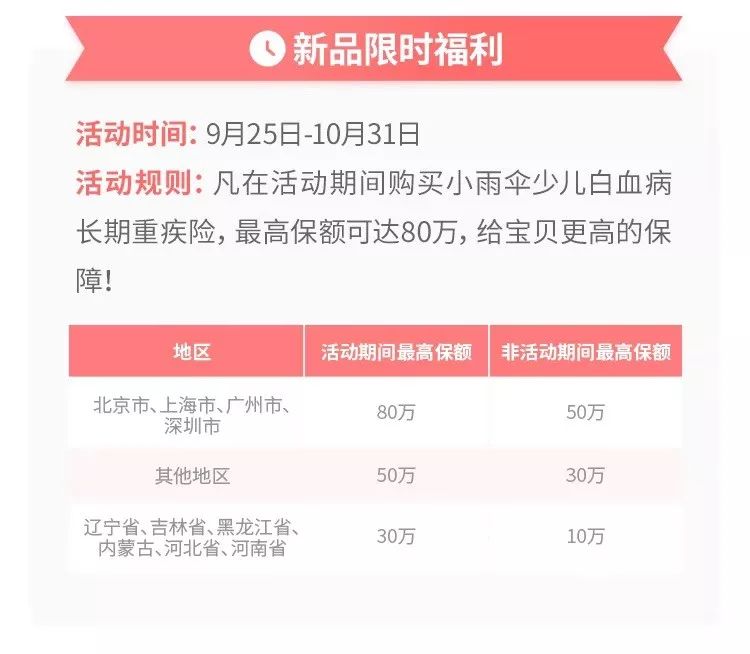 小雨伞萌娃少儿长期白血病保险保障额度最高有80万元(截止到10月31日),过了时间之后,最高额度可选50万。